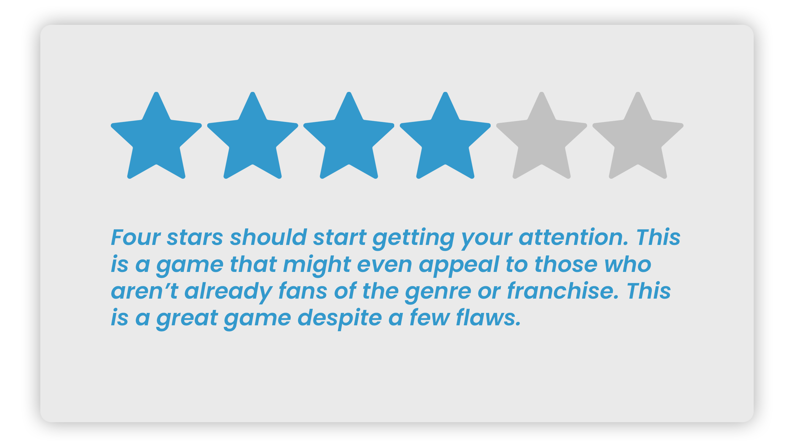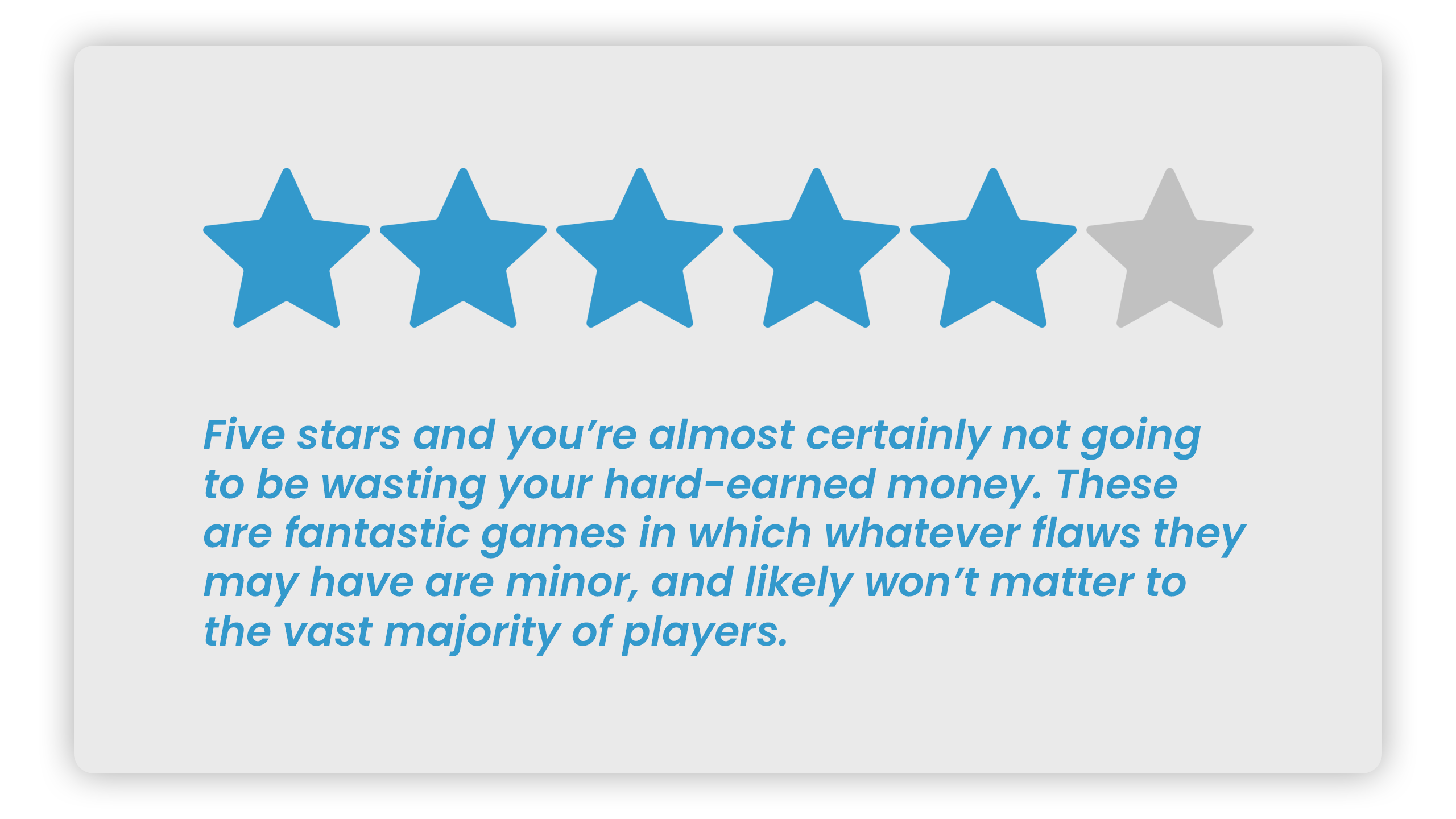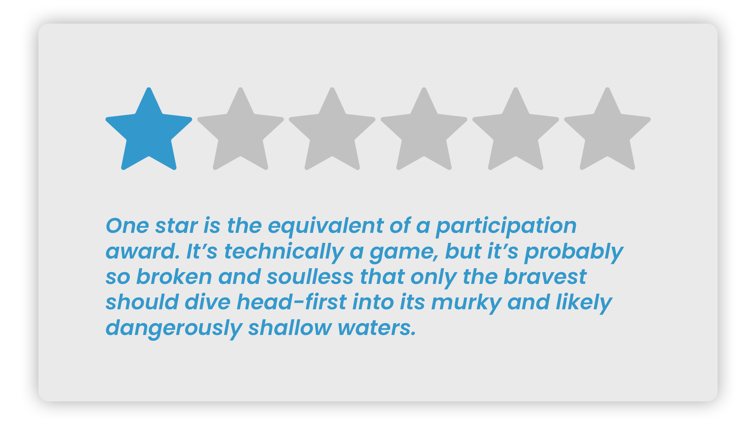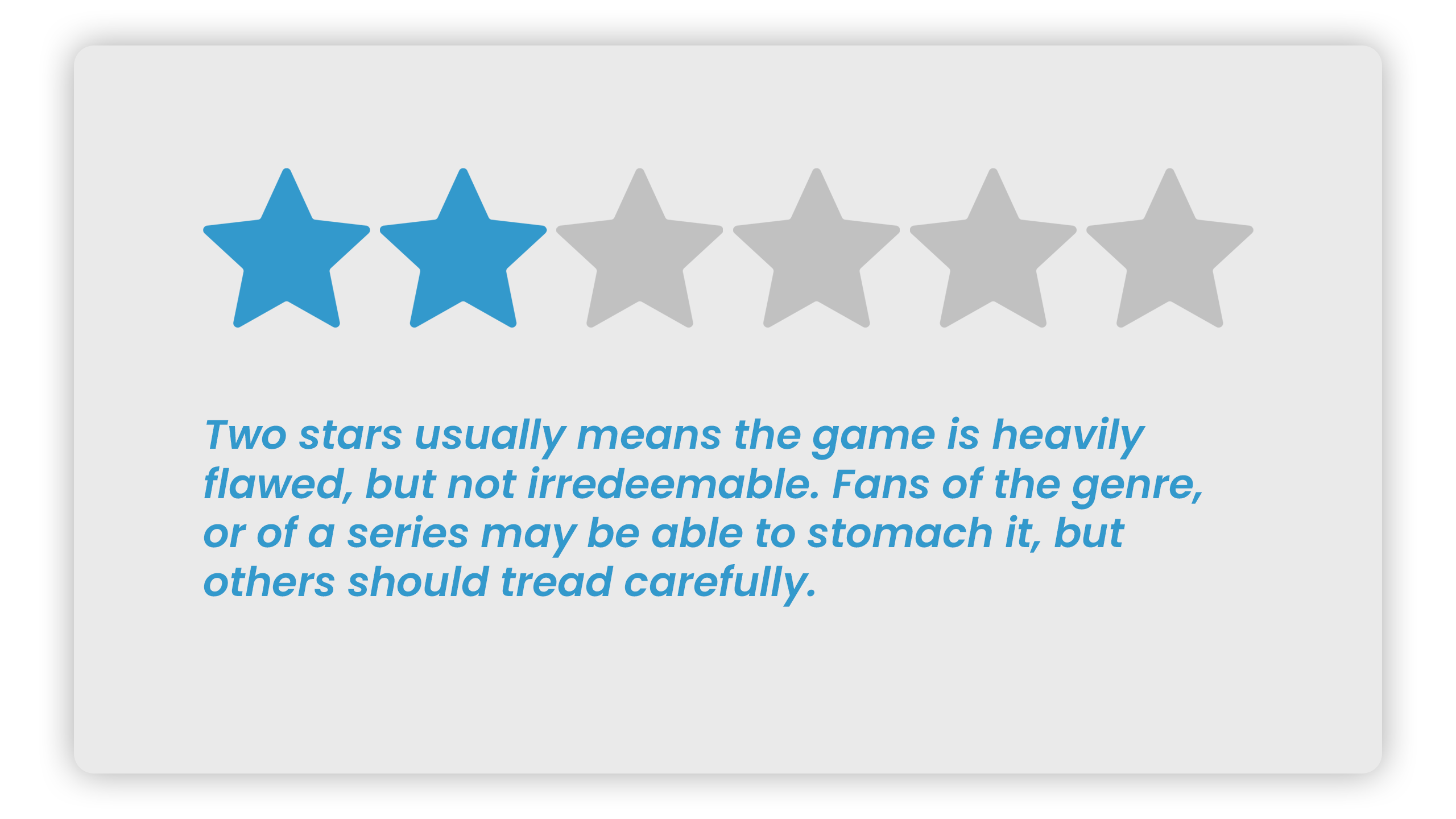 Someone might be naturally turned off by a game that's a 2/5 but if that 2/5 has great character and story writing held back by gameplay in a way they don't mind then that game might still be worth a look to them. The badges help fill the gaps that numbers alone can't cover, and if someone doesn't always have the time to read, watch, or listen to a whole review, it's a great way to get a better idea about the game at a glance. With that being said, it's helpful to know what each star rating and each badge represents - so here's an overview of the whole system: