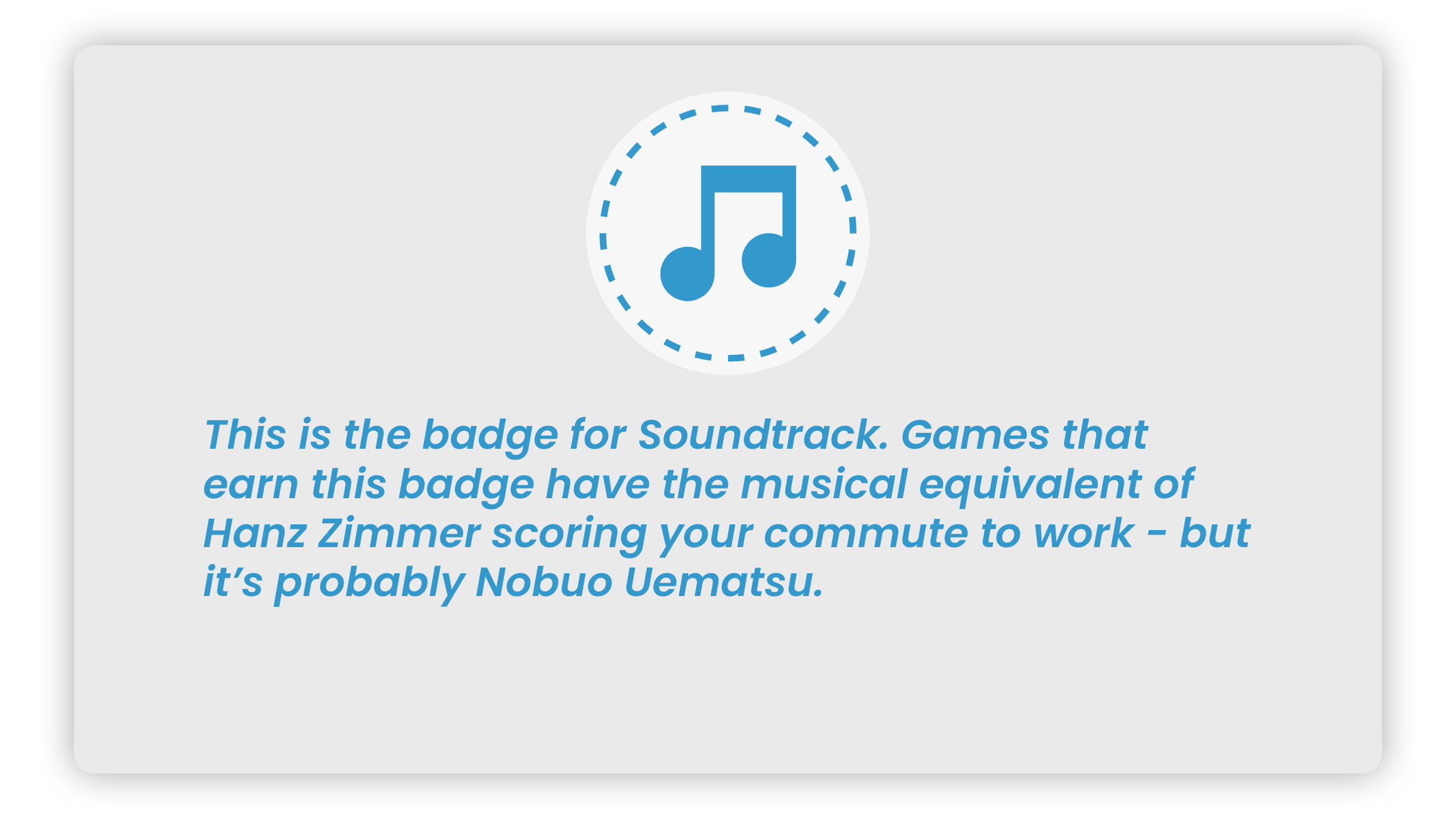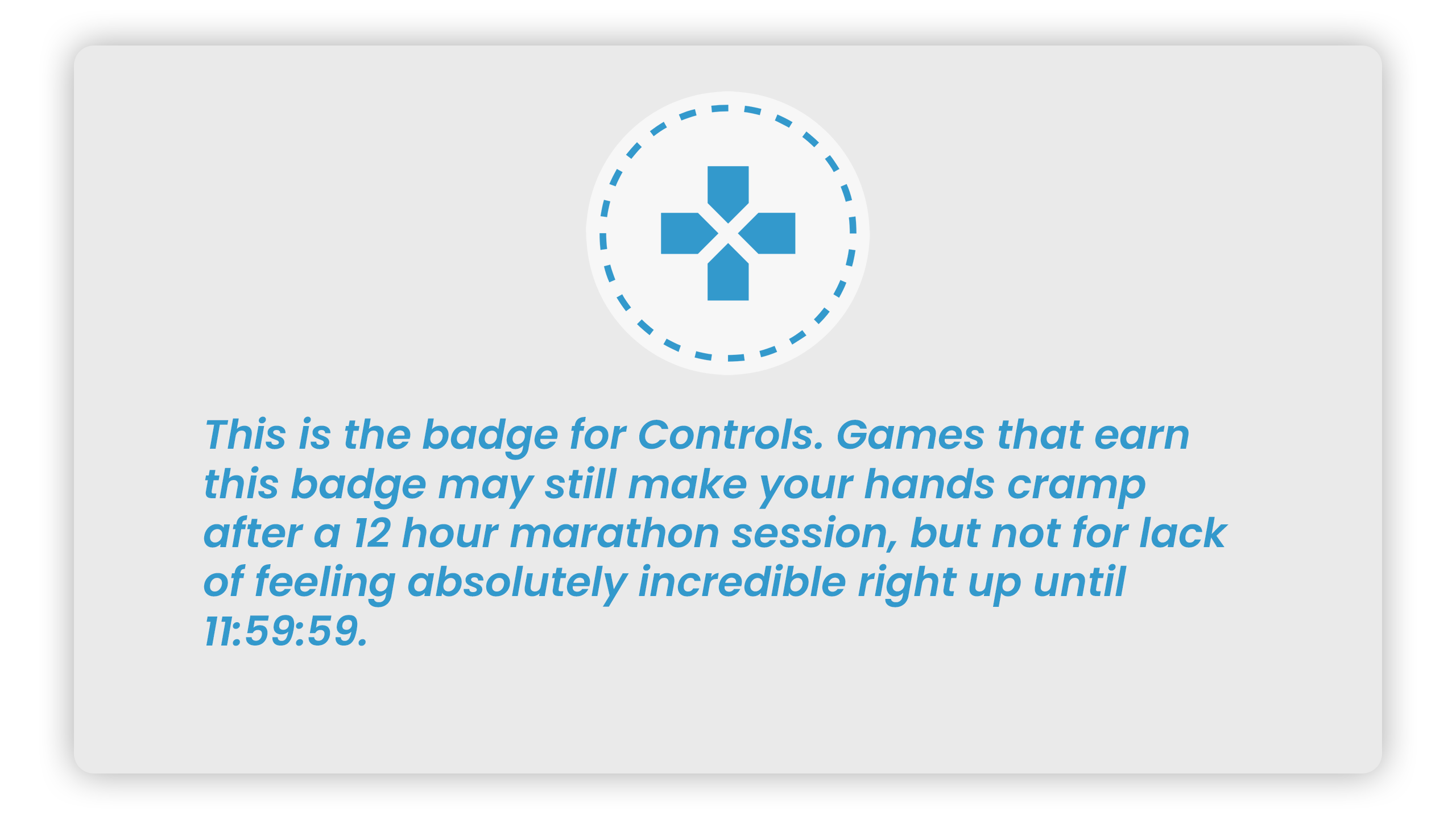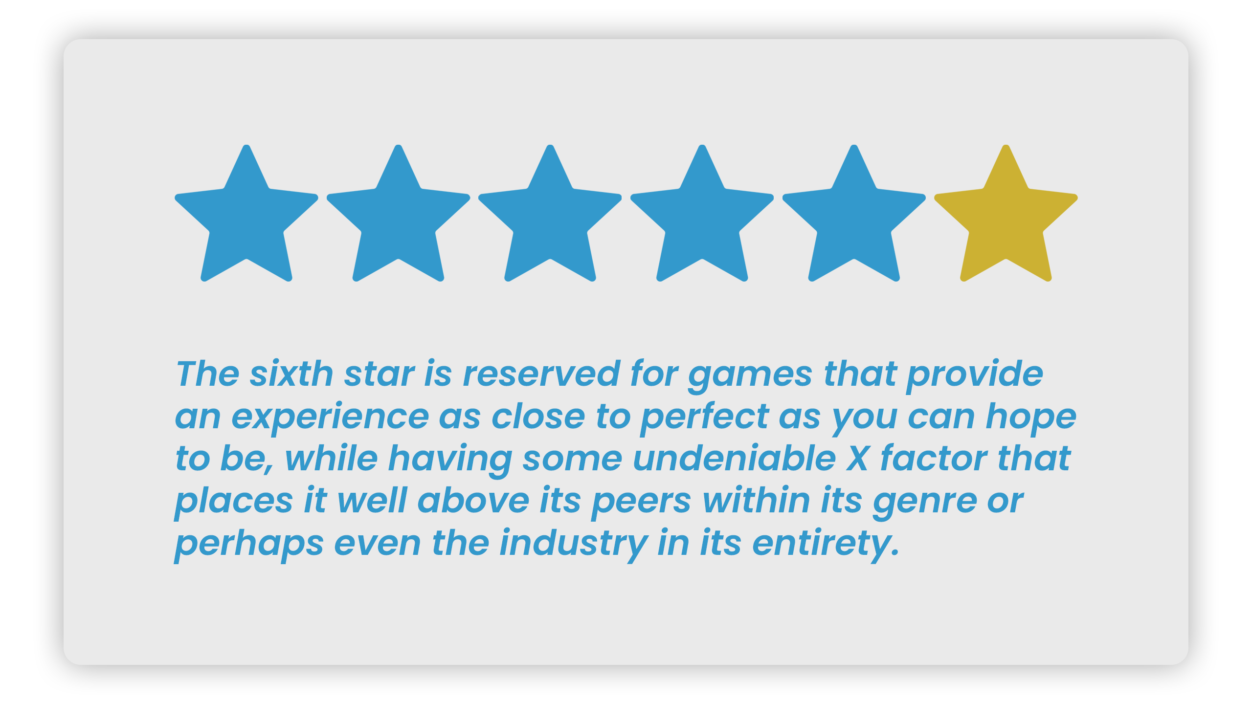 Eventually, I decided that, while a 5-star scale was great on its own, having something else also easily digestible to help a reader see if parts of what largely make up the game experience strongly contributed positively to the experience. That's when I created the badge system I use today.