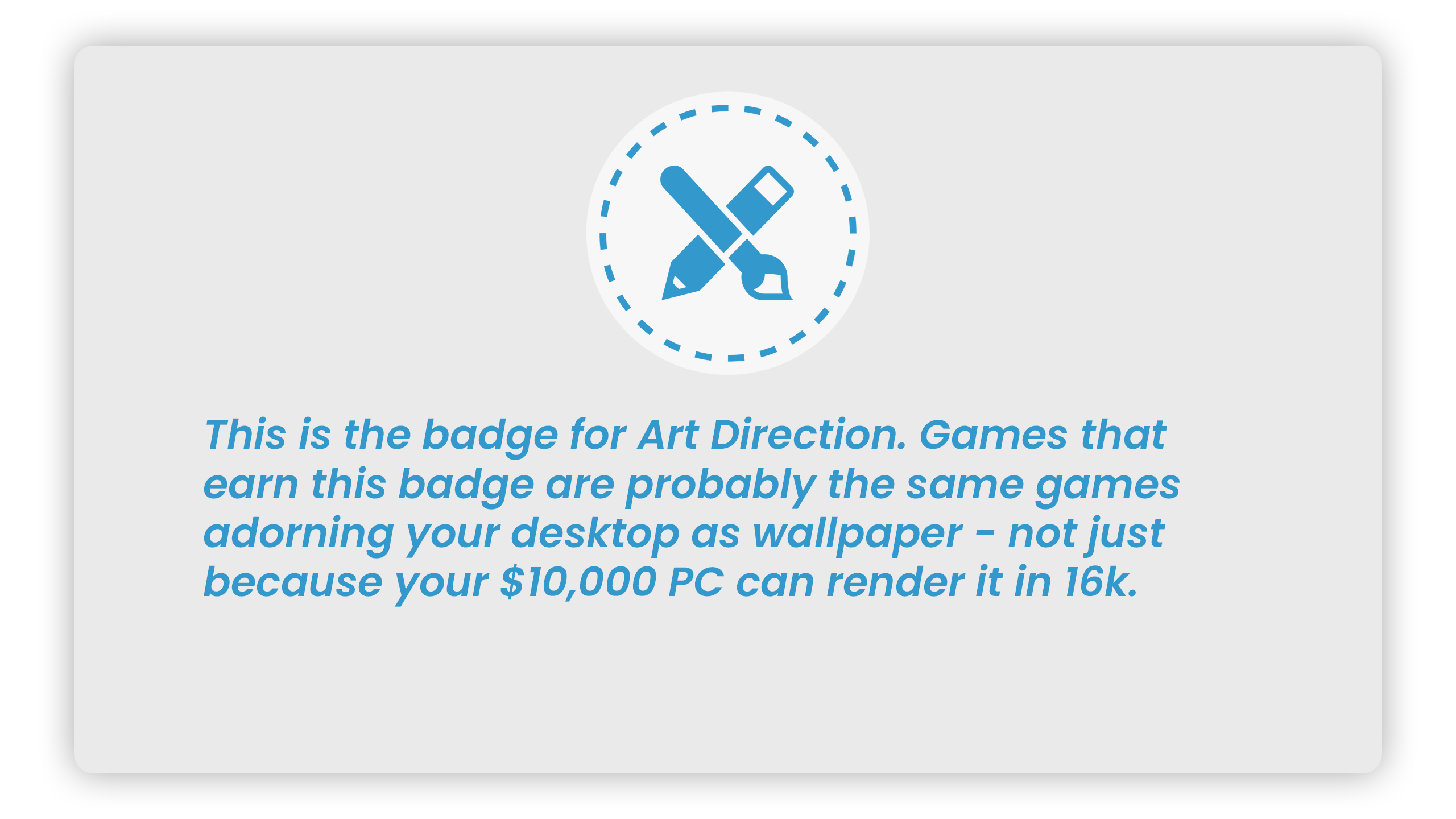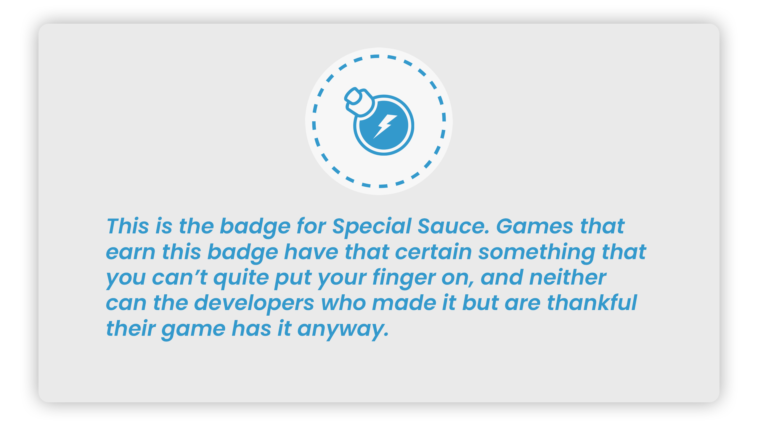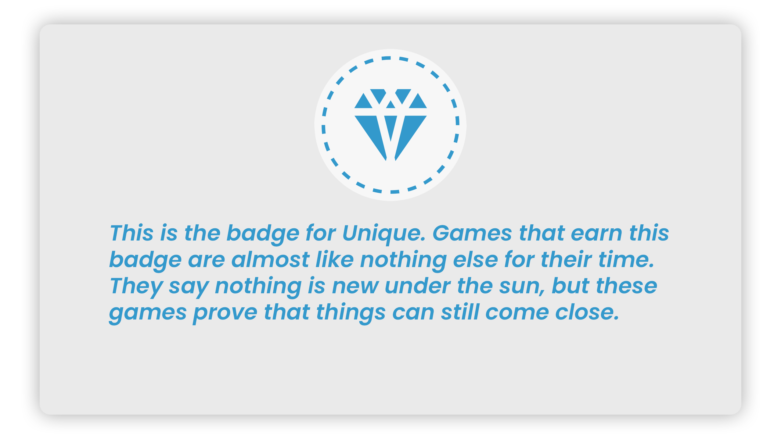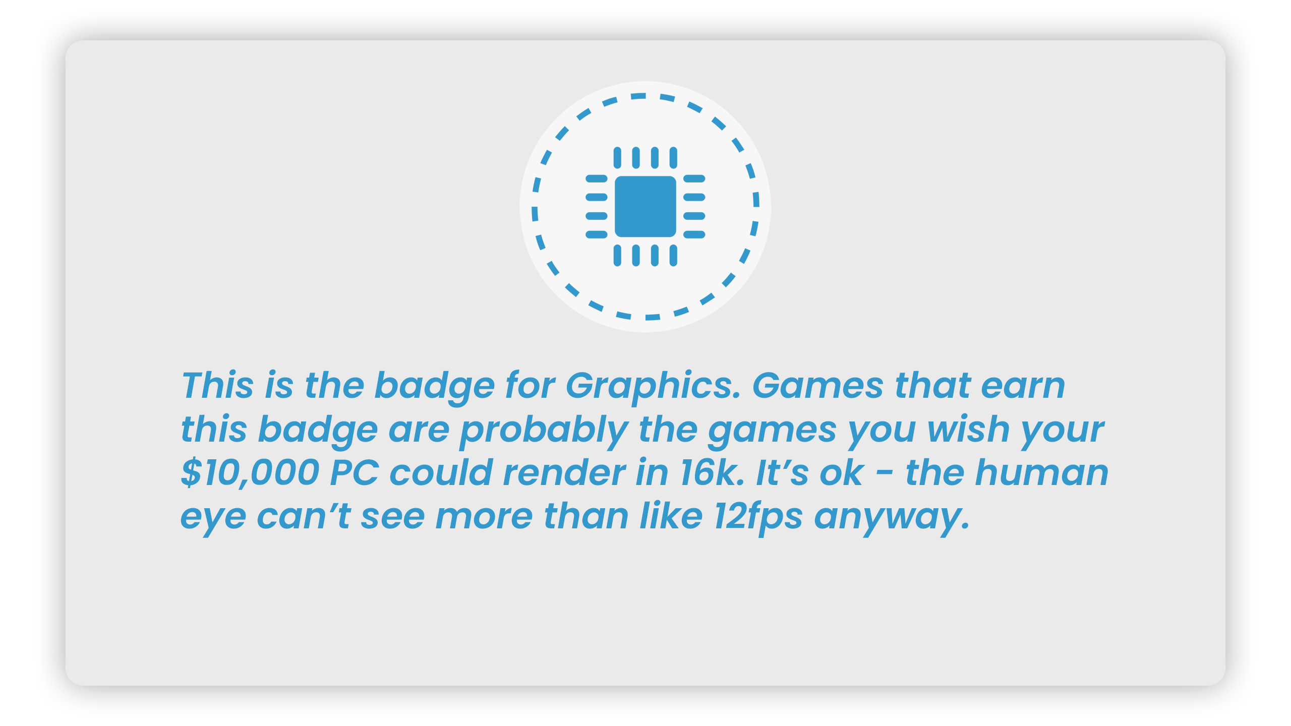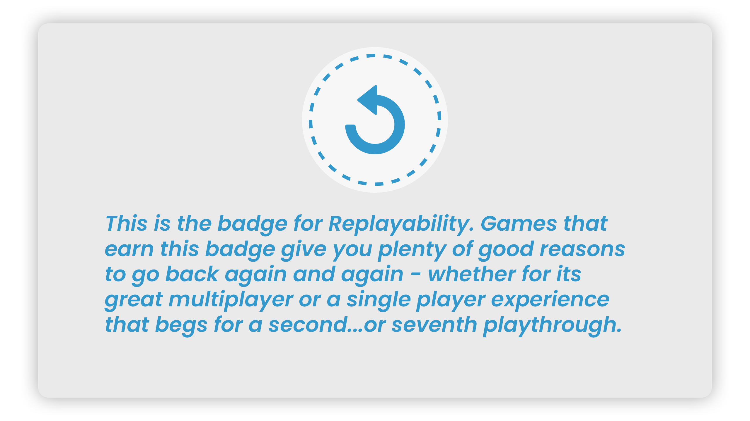 These twelve badges make up the main categories I think about when evaluating any game, and while the list isn't exhaustive, I tried to have them be representative of what most people would think about when making a purchasing decision beyond just a raw score.